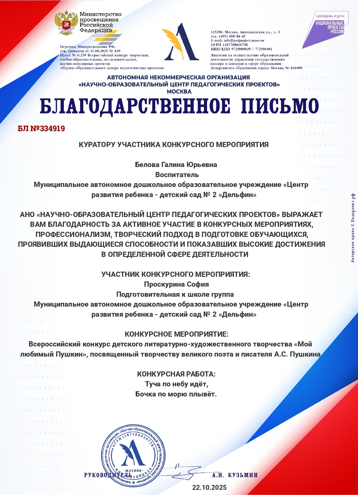 участнику Всероссийской патриотической акции работников дошкольной сферы образования и детей дошкольного возраста "ОБЛАКА МИРА И ДОБРА"