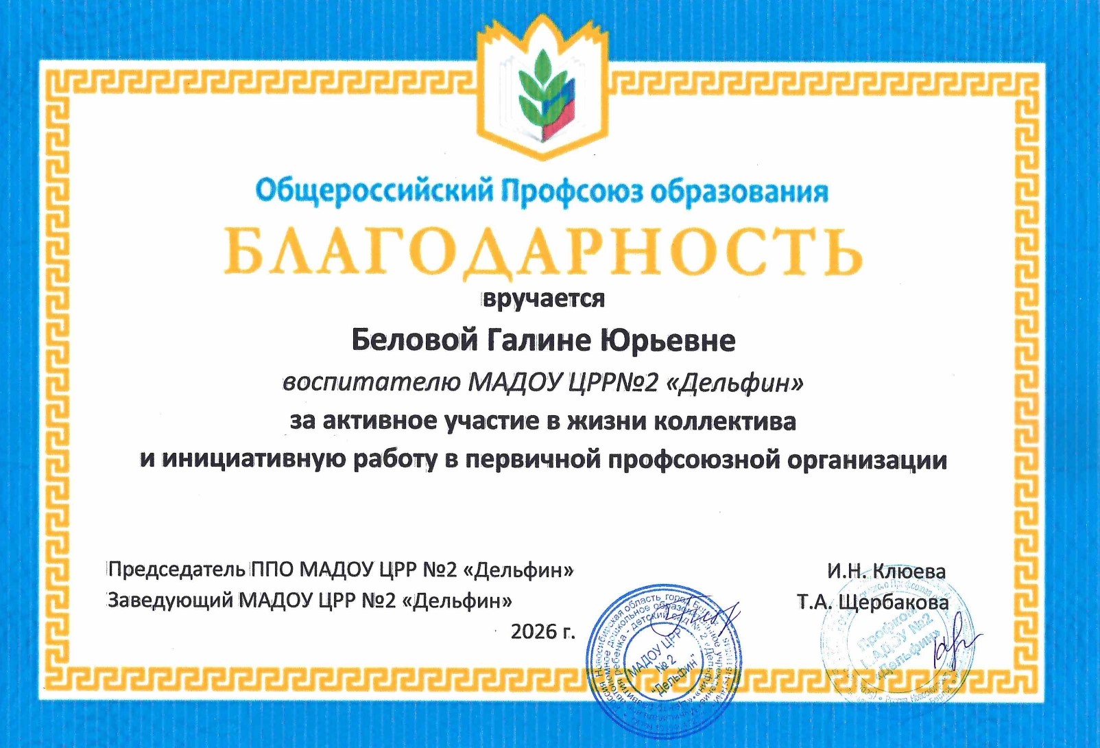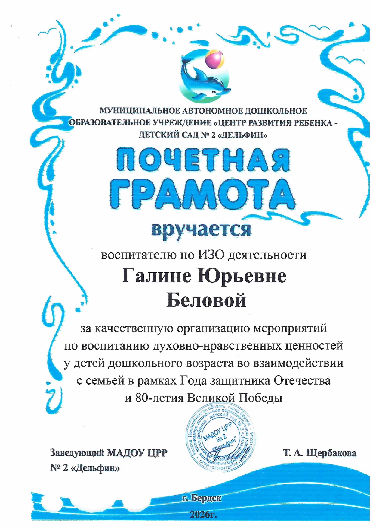 ПОЧЁТНАЯ ГРАМОТА МАДОУ ЦРР №2 "ДЕЛЬФИН"